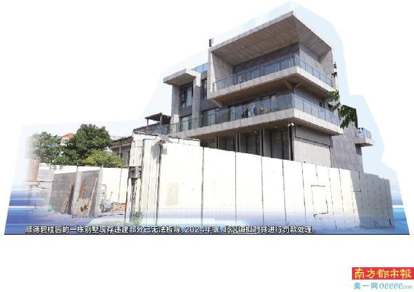 顺德碧桂园的一栋别墅现存违建部分已无法拆除,2024年底,北滘镇拟对其进行罚款处理。